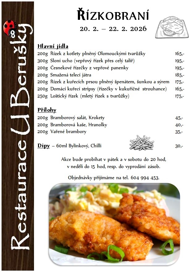 S již osvědčenou nabídkou se budeme na všechny masožrouty a milovníky tohoto smaženého obalovaného pokrmu těšit v rámci prodlouženého víkendu od 20. do 22. února v pátek a v sobotu do 20 hodin, v neděli do 15 hodin.